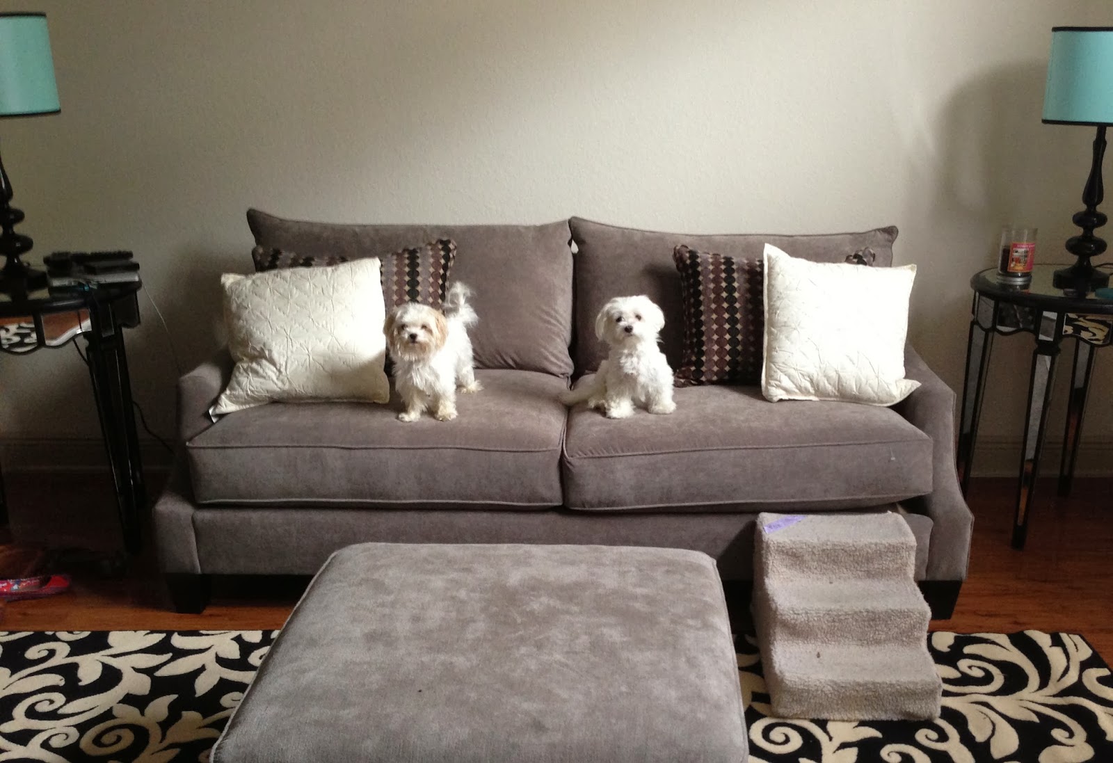 ReplyYour living room is so cute though! I love the rug and lamps .. and the little steps for your pups! I tried to use steps for Brutus to get into bed, but his fat ass busted them the first time he tried to walk up :) Have a great weekend!!